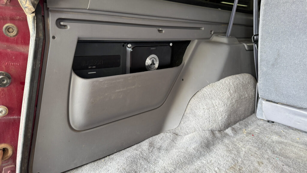 We removed the side panel and built an enclosure for the shallow Hertz Mille Pro MPS subwoofer to fit in the side panel. We covered it in similar material to the original interior to blend the look as much as possible. The DPS amplifier was tuned to the driver seat for a much improved sound and accurate music while retaining the original speaker locations. The dash was modified slightly to accommodate a Kenwood double din size head unit.
