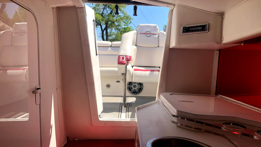 We doubled the cone area and added a second pair of 6.5″ Hertz speakers by the helm to get more volume. Then we found that the acrylic Fountain logos on either side of the boat by the rear bench seat would perfectly fit new 8 inch speakers, so they were removed and speakers went in their place. These are higher up to disperse sound farther than the front speakers. Under the rear bench was flat enough to accommodate two 10 inch Hertz Marine subwoofers. The pair of 6.5″ speakers in the cabin were also replaced with matching Hertz marine speakers. The system was powered by two JL Audio amplifiers.