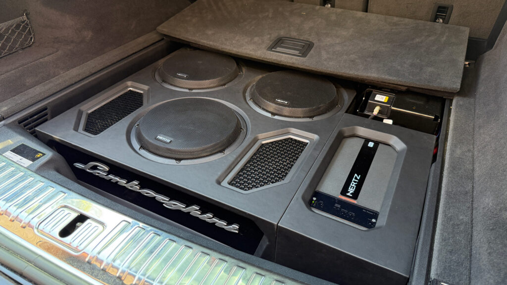 Custom subwoofer enclosure for three Hertz Mille Pro shallow 10-inch subwoofers and a Hertz Mille Pro amplifier